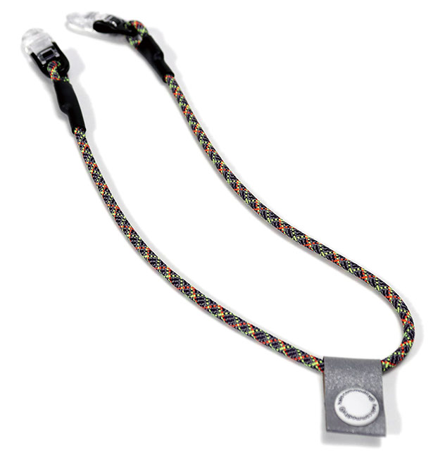 風が吹いても飛ばないよう、アウターと帽子をしっかりと留めておけるクリップタイプのハットコード。オリジナルカラーで製作したコードを使用しています。先端に付けたオリジナルのリフレクトテープは夜間の使用時の視認性を担っています。