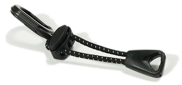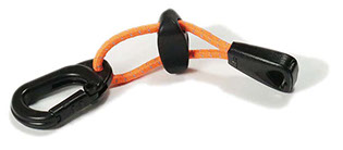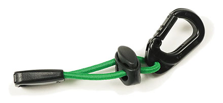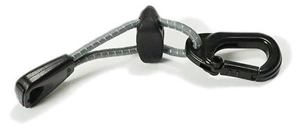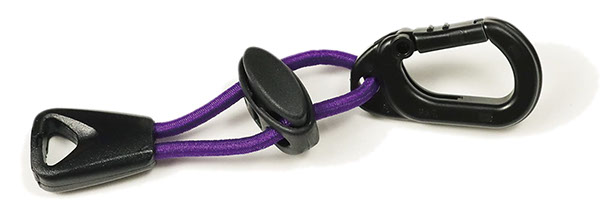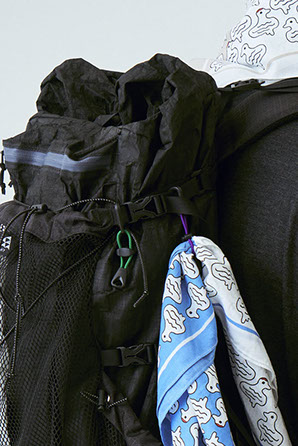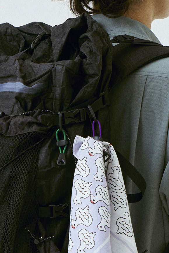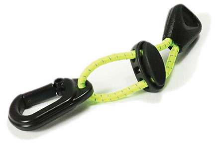 バンダナや手ぬぐいを結ばずに留める事が出来るフックコード。カラビナのように引っ掛けることが可能。ザックや首元につけたりと使い方は自由自在です。使用しているストレッチコードは再帰反射になっており夜間の使用時の視認性を担っています。