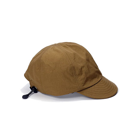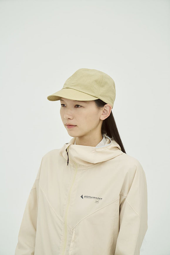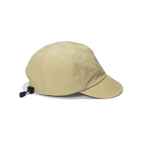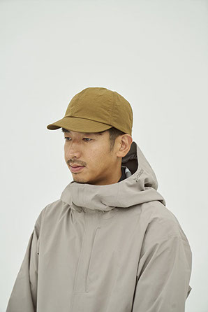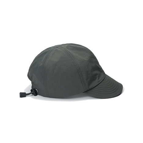 撥水加工を施したリサイクルナイロン素材を使用した、パッカブル仕様のキャップ。程よい深さの6パネルクラウンが頭にしっかりフィットし、安定感のある被り心地を実現しています。内側には通気性に優れたメッシュ素材を、アジャスターの片側には平ゴムを採用。さらに、後部のドローコードにより着用したままでもスムーズなサイズ調整が可能です。付属のミニサコッシュの
