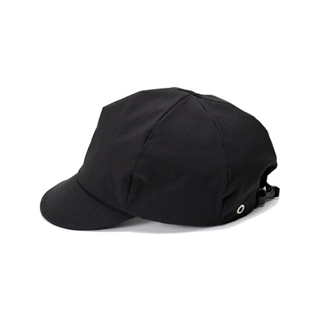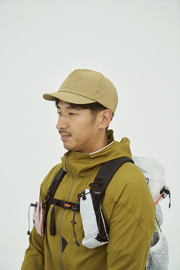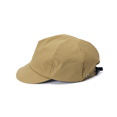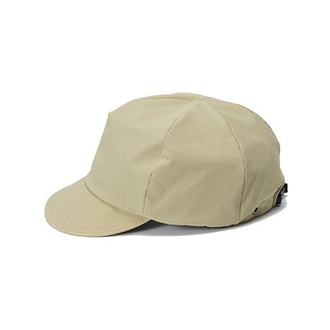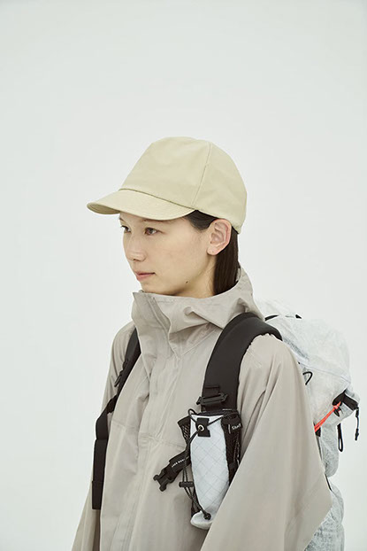 紫外線遮蔽率90%以上を持つ伸縮性ナイロンリップストップを採用し、裏地には銀イオンによる抗菌防臭・制菌性を有するメッシュを使用し機能面と軽さを重視しました。アジャスターベルトの片側には10mm幅の平ゴムを合わせ、フィット性を上げています。汗止め用のリムテープは吸水速乾・放湿冷却・消臭・抗菌・防臭効果のある素材を使用。丸洗い可能でアクティブなシーンにも活躍してくれます。
