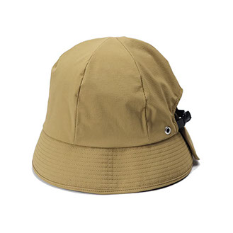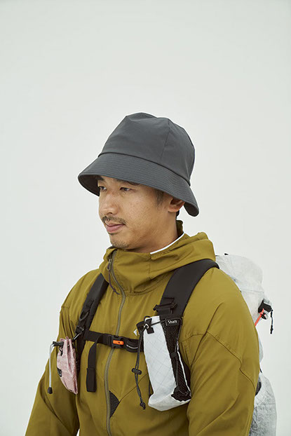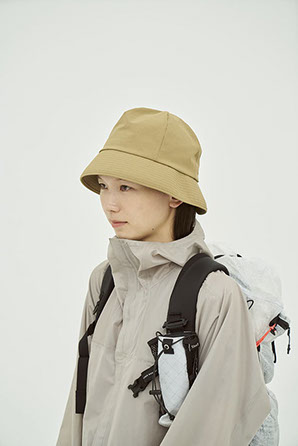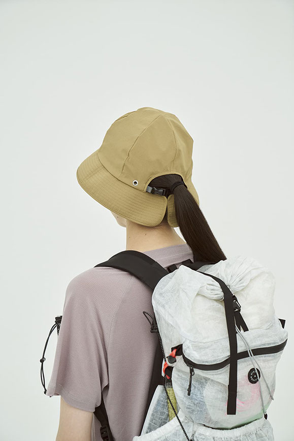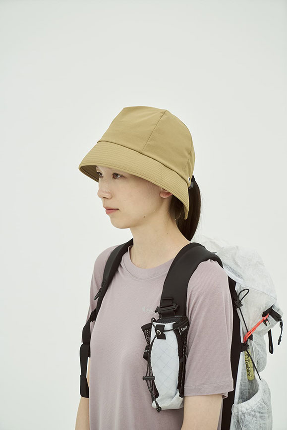 紫外線遮蔽率90%以上を持つ伸縮性ナイロンリップストップを採用し、裏地には銀イオンによる抗菌防臭・制菌性を有するメッシュを使用し機能面と軽さを重視しました。つばの後ろ部分を割り、サイズ調整をしやすくしています。そのアジャスター部分より結んだ髪を出す事もできます。汗止め用のリムテープは吸水速乾・放湿冷却・消臭・抗菌・防臭効果のある素材を使用。丸洗い可能でアクティブなシーンにも活躍してくれます。