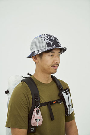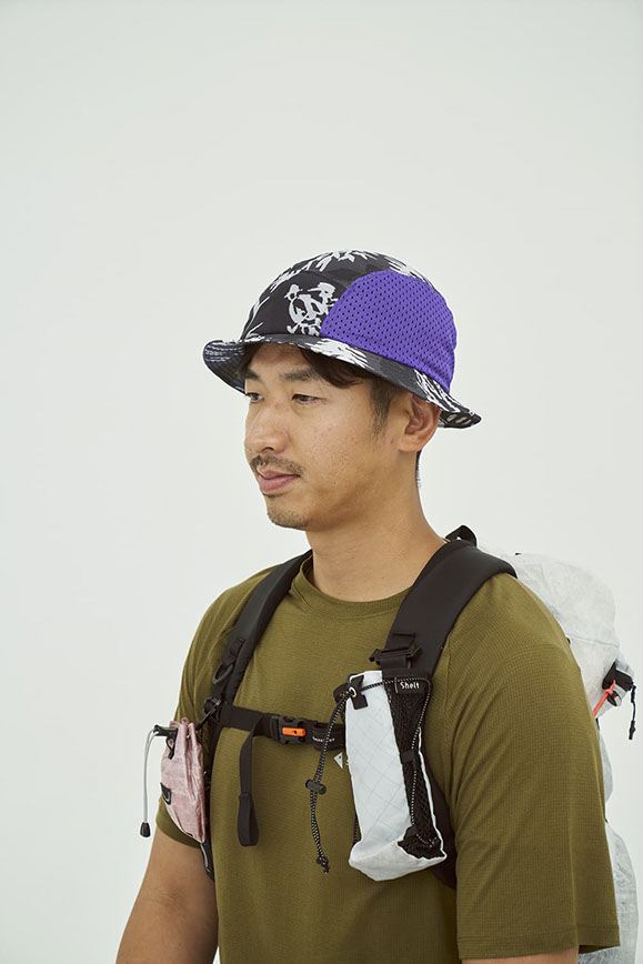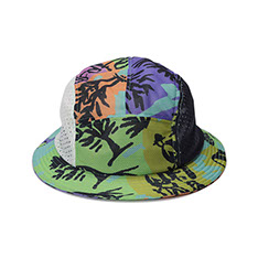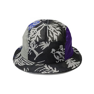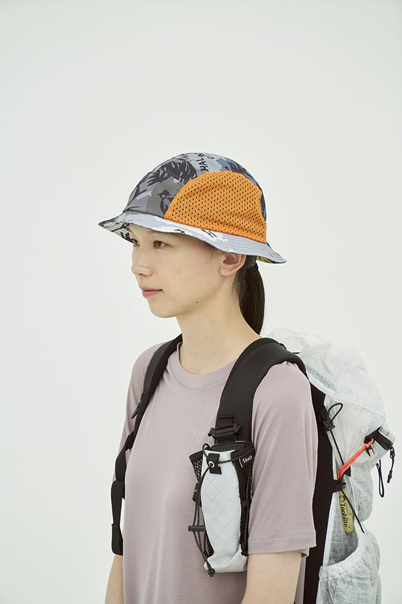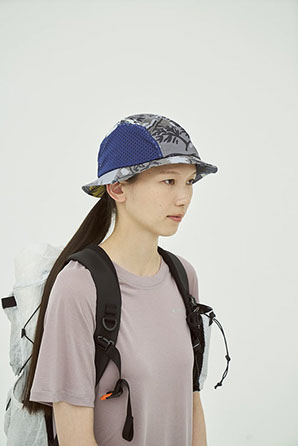 吸水速乾性と抗菌性を備えたリフレスマイル素材にプリントを施し、通気性の高いメッシュと組み合わせたハット。サイドの切り替えが通気性を高め、左右で色を変えたメッシュが視覚的な特徴となります。ツバは短めに設計し、日差しを抑えつつ軽快な使い心地を実現します。内側のリムテープは吸水速乾・放湿冷却・消臭・抗菌防臭機能を備え、外付けのドローコードにより被ったままサイズ調整が可能です。