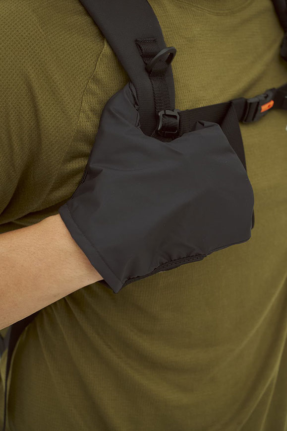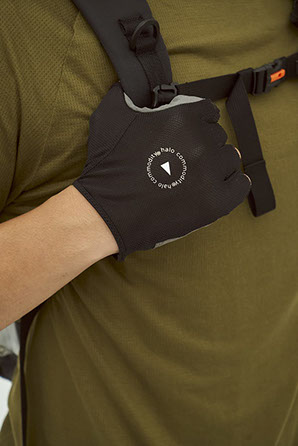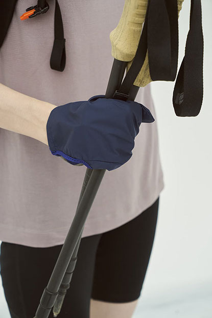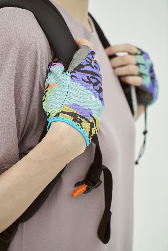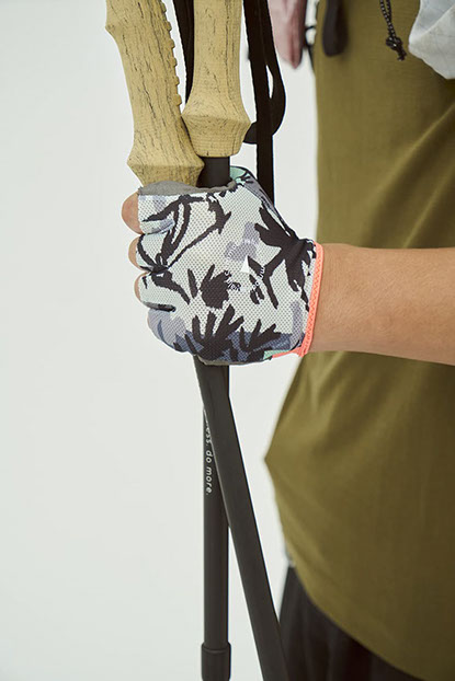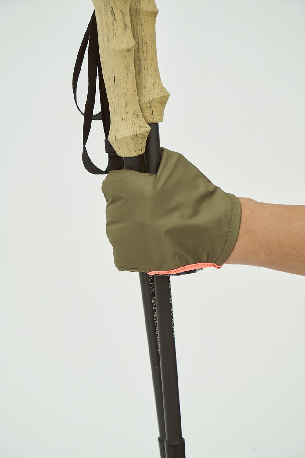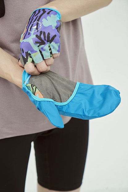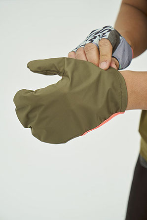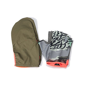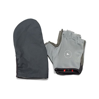 指先を解放したメッシュグローブをベースに、必要に応じて透湿防水のフードを装着できる2WAY仕様。手のひらには「ナノフロント」を採用し、確かなグリップ力と汗の吸収・拡散性を実現。甲側は抗菌性と速乾性に優れた「リフレスマイル」を用い、銀イオンによる清潔さと快適なドライ感を保持。オーバーグローブには防水透湿ナイロンストレッチを配し、環境変化に応じた操作性と快適性を備えています。